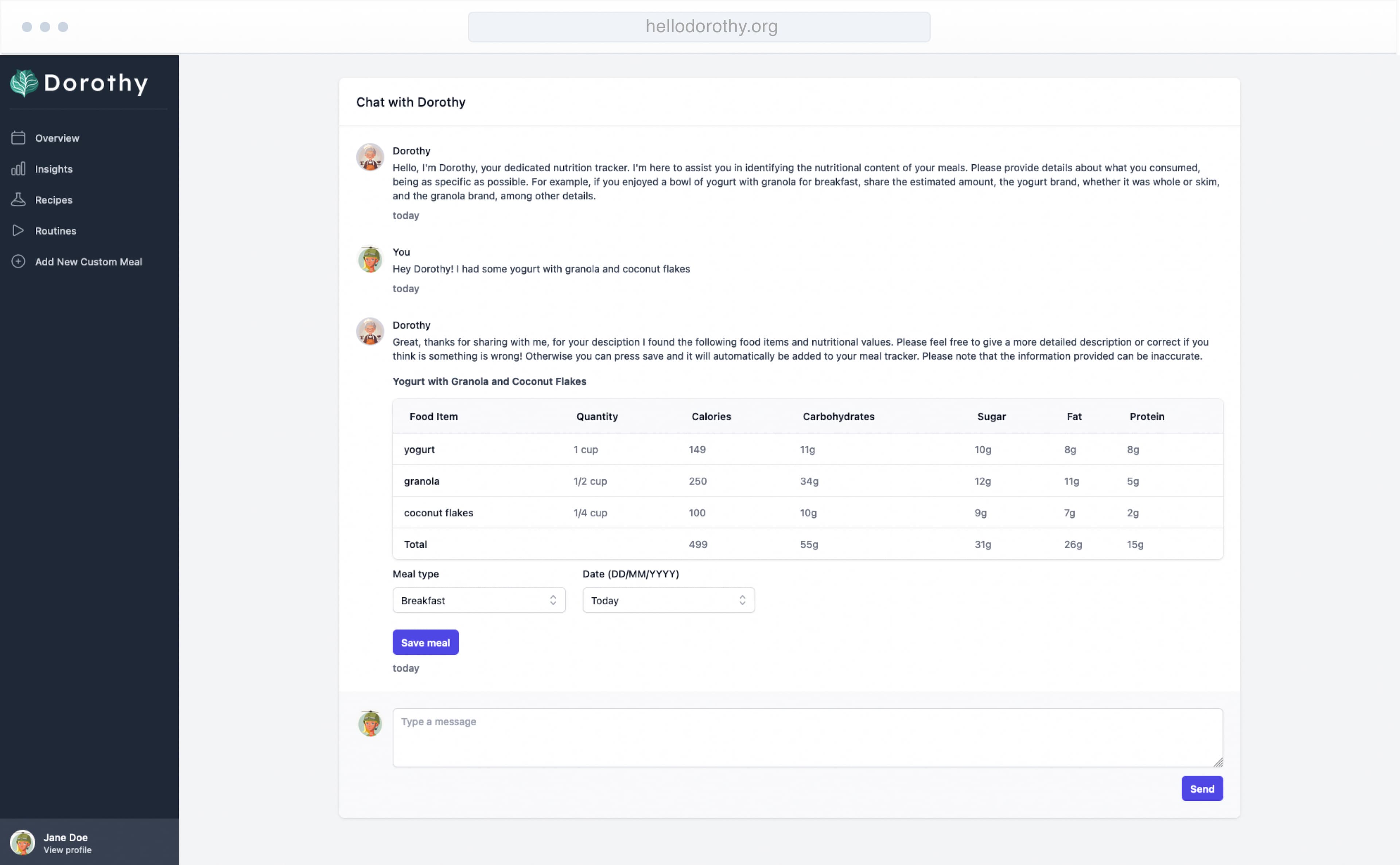 Dorothy is build to streamline the process of tracking your meals, you can literally start by just chatting with Dorothy about what you ate.